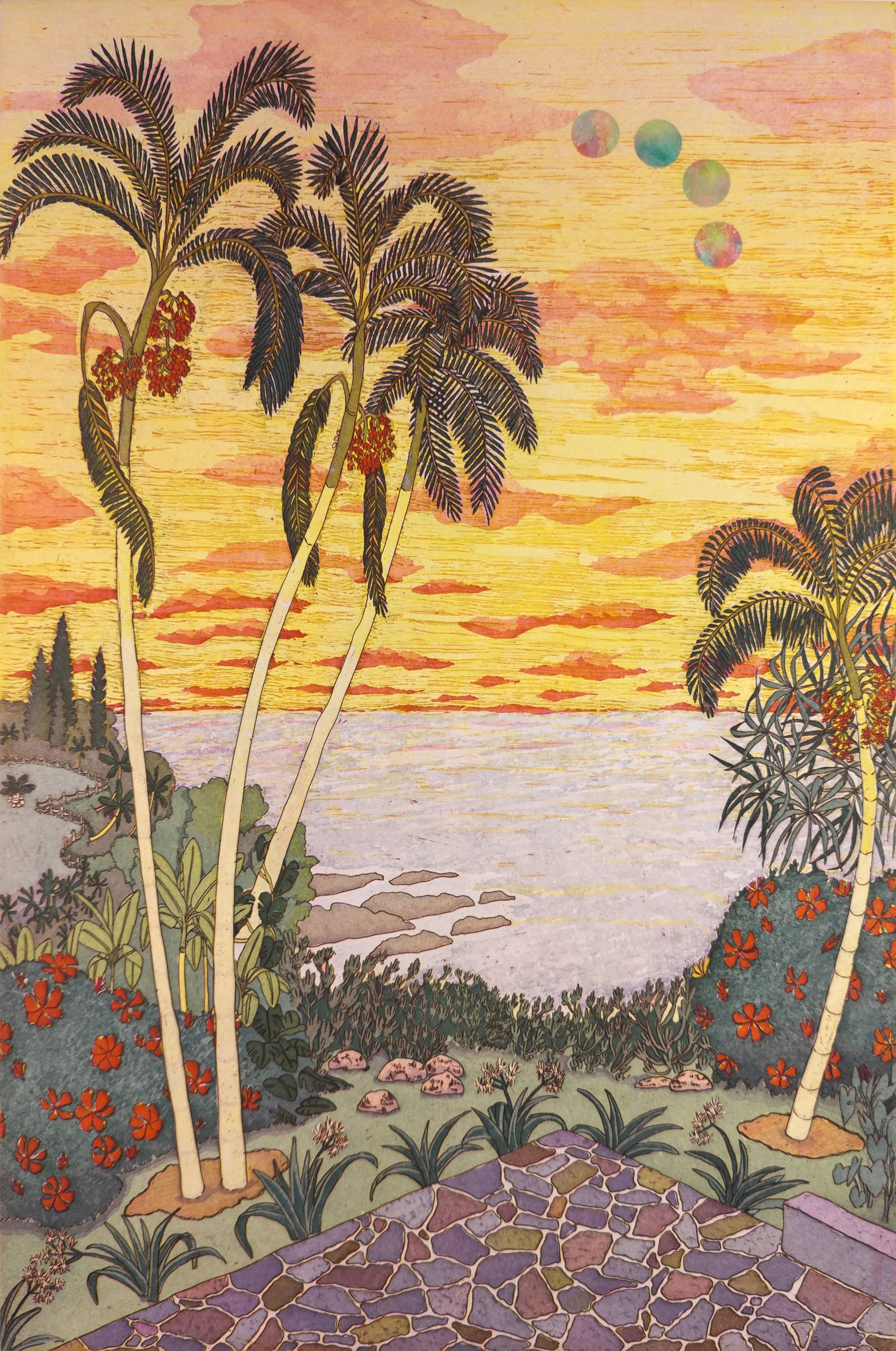 5 color hard ground and aquatint etching with burnished aquatint and chine collé